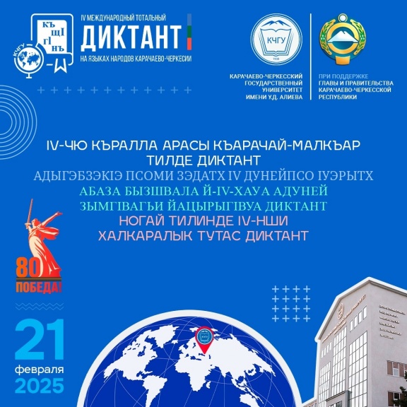 IV Международный тотальный диктант на языках народов Карачаево-Черкесии приурочен к 80-летию Победы в Великой Отечественной войне. Это значимое событие объединит людей, интересующихся культурой и историей народов Карачаево-Черкесии, а также станет возможностью проверить свои знания родного языка.