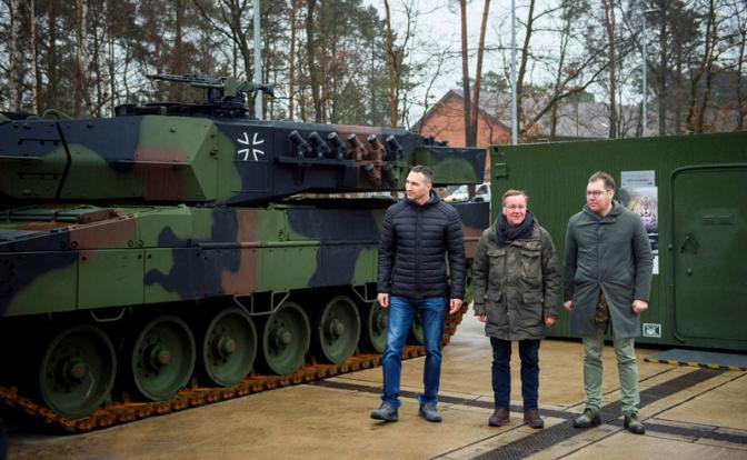 На фото: Владимир Кличко, бывший боксер и брат мэра Киева Виталия Кличко (слева), министр обороны Германии Борис Писториус (в центре) и посол Украины в Германии Алексей Макеев стоят рядом с танком Leopard 2 (Фото: