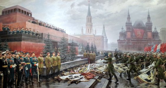 Другим знаковым символом стал Парад Победы 24 июня 1945 года. Его завершил марш знаменосцев, о котором Г.К. Жуков писал: «Ни с чем не сравнимым был момент, когда двести бойцов — ветеранов войны под барабанный бой бросили к подножию Мавзолея В.И. Ленина двести знамён немецко-фашистской армии. Пусть помнят этот исторический акт реваншисты, любители военных авантюр!»