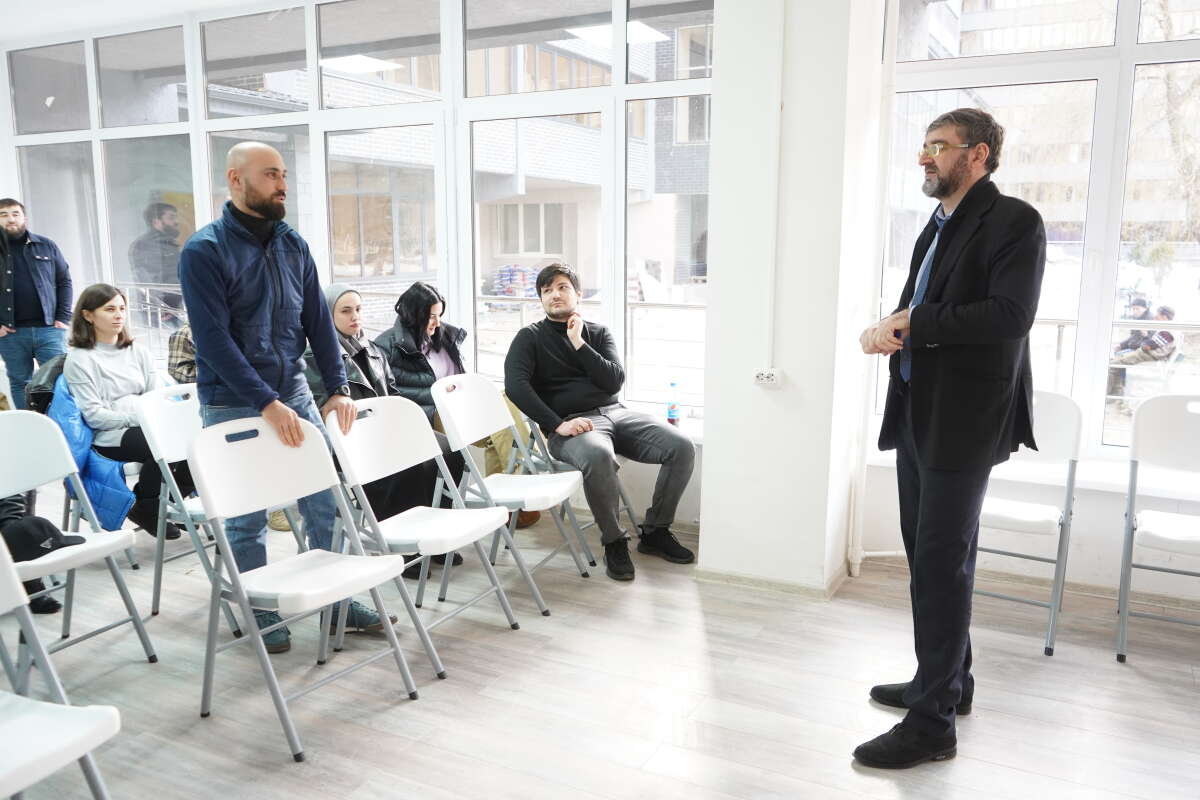 Встреча с советником Главы КЧР Алибеком Узденовым собрала сегодня в коворкинг-пространстве университета студентов и молодых сотрудников – авторов проектов-грантобладателей.