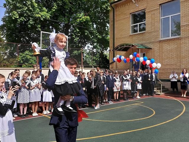 В завершении линейки прозвучал последний звонок. Его дали выпускник 11 класса Роман Курбан-Алиев и первоклассница Елизавета Федоркина.
