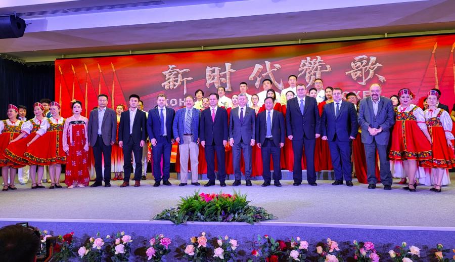 Торжественная часть встречи была продолжена концертной программой по мотивам героико-революционных произведений КНР, народных русских и китайских танцев. Творческие номера были поставлены и исполнены силами коллектива Международного торгово-выставочного комплекса «GREENWOOD».