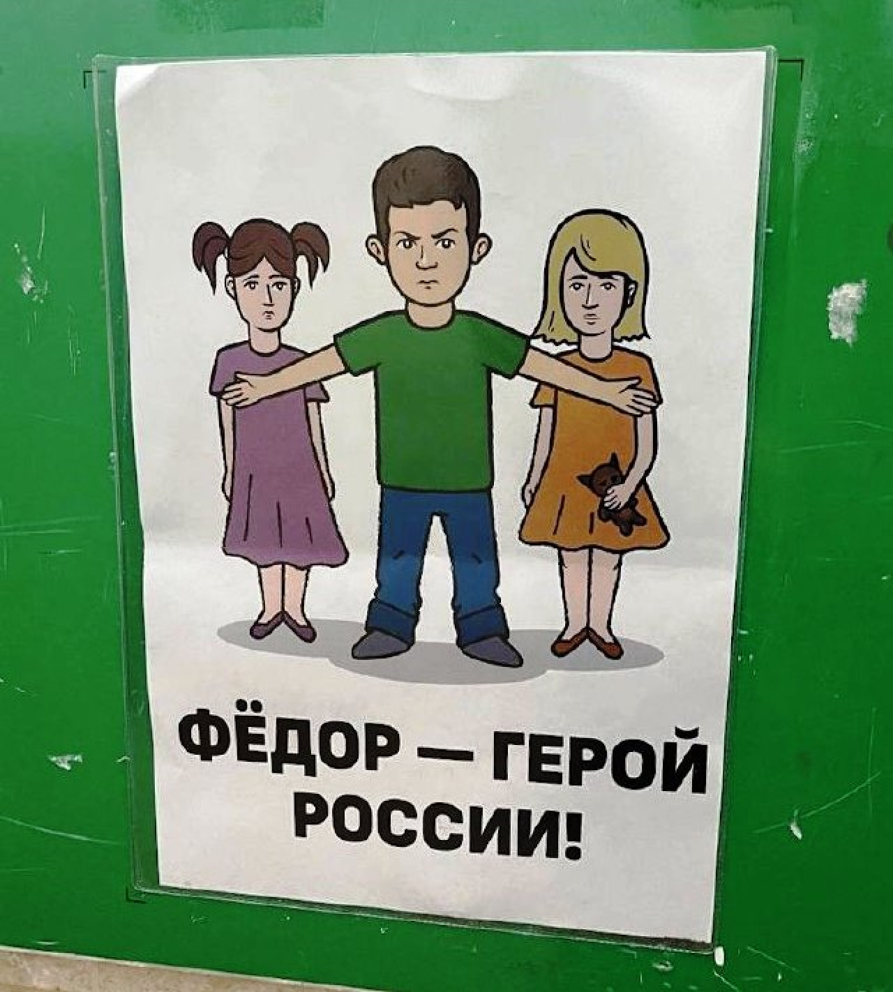 На плакате изображен мальчик, который закрывает собой двух девочек, готовясь защитить их. Под картинкой надпись - «Федор - герой России». Плакаты развешаны на остановках общественного транспорта.