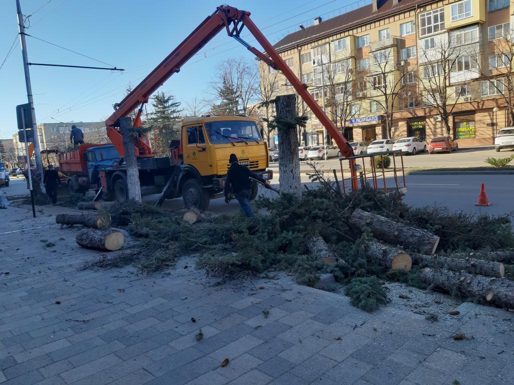 Черкесск. Площадь имени Кирова в 2024 и 2019 годах. Так убили в декабре 2024 года деревья ради автостоянки при переделке иностранного KFС в Rostics...