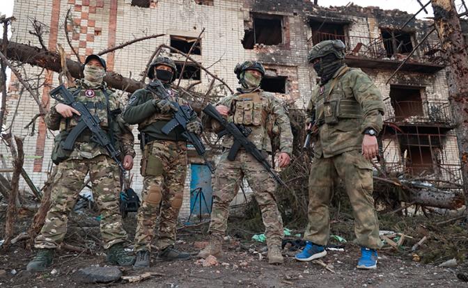 На фото: Артемовск (Бахмут). Бойцы ЧВК «Вагнер» у дома, разрушенного в результате обстрела.