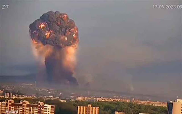 ВКС РФ в ночь на 13 мая нанесли удар по складам с ракетным и артиллерийским вооружением западнее Хмельницкого. После чего произошёл мощный взрыв. Согласно обнародованным видео, после первого взрыва в воздух поднялся столб пламени и дыма в виде грибовидного облака, после второго взрыва — белый фон.