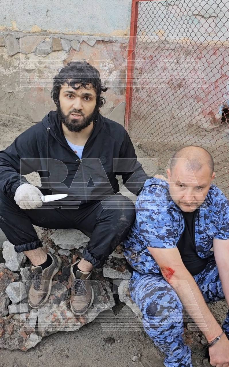 По телеграм-каналам распространяется видео, снятое во дворе, где террористы удерживали в качестве заложников двух сотрудников ФСИН. Все шесть мужчин были застрелены . Двое из них в наручниках.