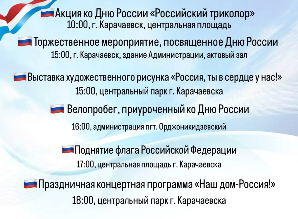 Приглашаем вас принять участие в праздничных мероприятиях, посвященных празднованию Дня Российской Федерации, которые состоятся 11 июня в Карачаевске.