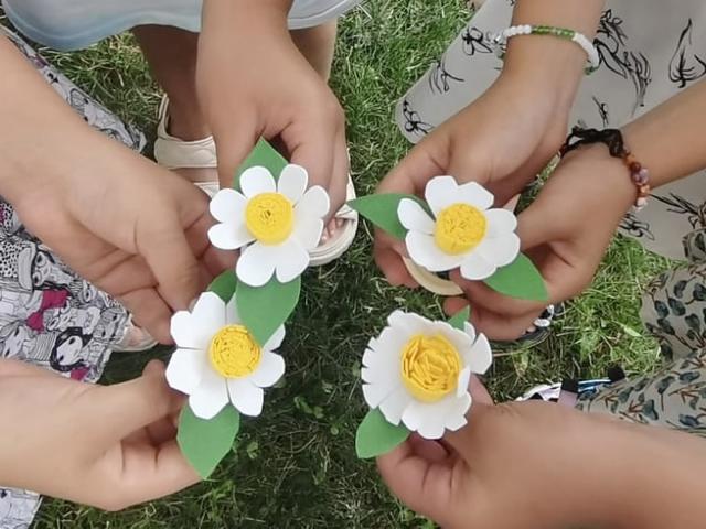 Под звучание живой музыки на лужайке в тени деревьев прошли шесть мастер-классов для детей разных возрастов. Малыши занимались «производством» белых цветов из разных материалов для открыток и украшений, а ребята постарше вязали на коклюшках и плели корзины из рогоза. Все мастер-классы прошли силами мам с детьми и добровольцев «Дома для мамы».