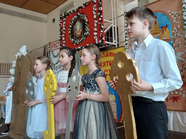 Шестиклассники под руководством заместителя директора по воспитательной работе Татьяны Синявской показали зрителям спектакль «Праздник Пасхи» о добре и щедром сердце маленькой девочки, сумевшей подарить радость праздника Пасхи всем окружающим.