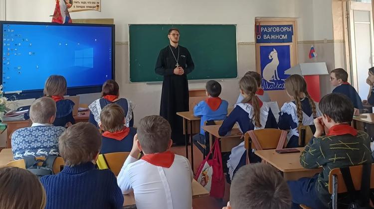На урок ОРКСЭ в шестой класс школы №1 станицы Кардоникской пришёл в гости настоятель станичного Покровского храма иерей Иоанн Саенко .