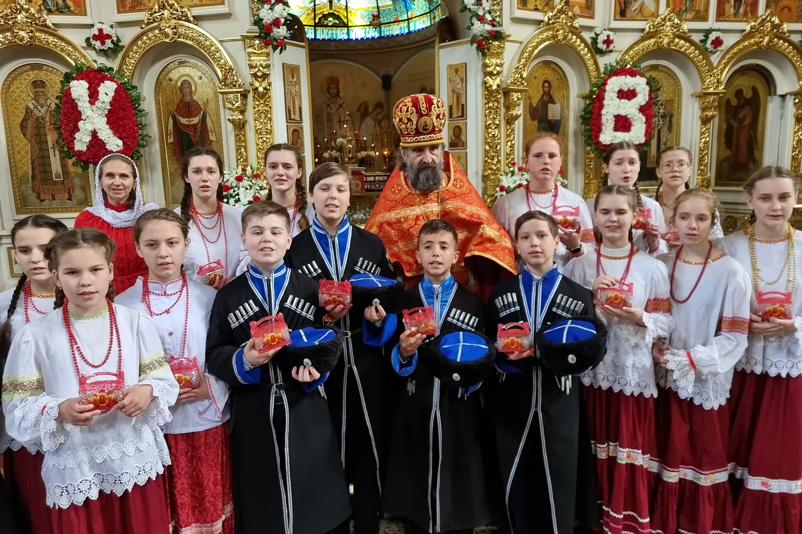 После Пасхального крестного хода настоятель Никольского собора , директор гимназии протоиерей Иоанн Знаменский детям вручил пасхальные сладкие подарки.