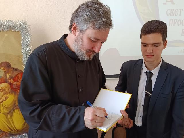 Директор гимназии протоиерей Иоанн Знаменский представил гимназистам клирика храма Казанской иконы Божией Матери на Калужской площади в Москве, кандидата богословия и культурологии, педагога, сценариста, мультипликатора, члена Союза писателей Москвы диакона Илию и отметил его творческие способности и умение находить общий язык с молодежной аудиторией.