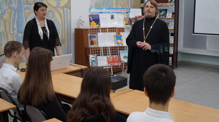 У восьмиклассников двух школ города Черкесска прошли открытые уроки мужества с участием священника. Отец Александр Гурин рассказал школьникам о подвиге предков - защитников Отечества, призвал детей подражать их мужеству. С 8 Г классом школы № 11 встреча прошла в Республиканской детской библиотеке имени С. П. Никулина, а с 8 А классом гимназии № 9 – в музее истории Церкви казачества при Никольском соборе города. После урока для гостей провели экскурсию по музею.